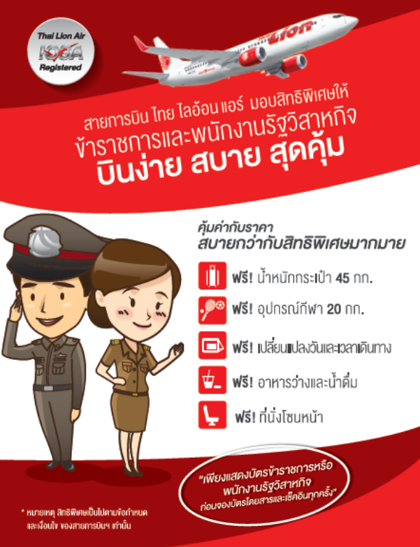 กลุ่มลูกค้าราชการและพนักงานรัฐวิสาหกิจจะได้รับความยืดหยุ่นในการเดินทางกรณีเร่งด่วน ทางสายการบิน ไทยไลอ้อนแอร์ เรียนเชิญท่านเป็นส่วนหนึ่งของสายการบินที่มีอัตราการเติบโตอย่างรวดเร็วและพบประสบการณ์กับเครื่องบินโบอิ๊ง 737-900ER และ 737-800 คุณจะรู้สึกประหลาดใจกับการกำหนดมาตรฐานใหม่เพื่อคุณ